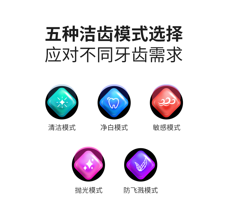 3、五种洁齿模式:清洁 / 净白 / 敏感 / 抛光 / 防飞溅,多场景适配?