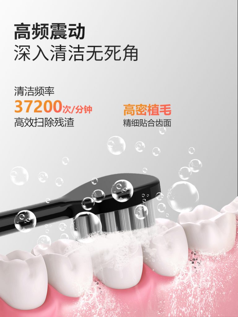 1、高密植毛刷头:贴合齿面,37200 次 / 分钟高频震动,无清洁盲区?