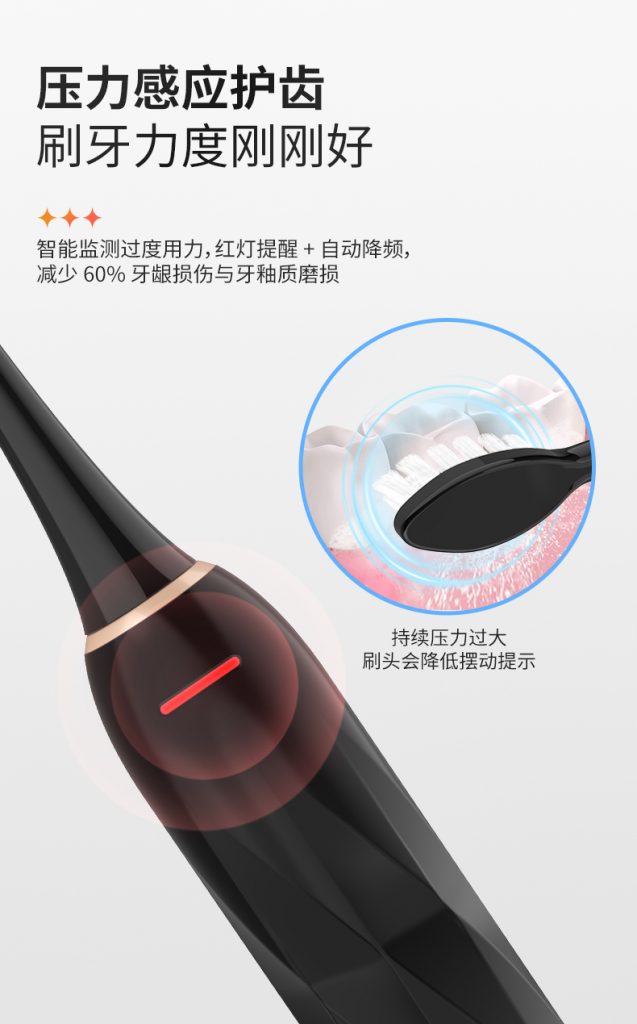 2、压力感应护齿:监测力度,红灯提醒 + 自动降频,减 60% 牙龈损伤?