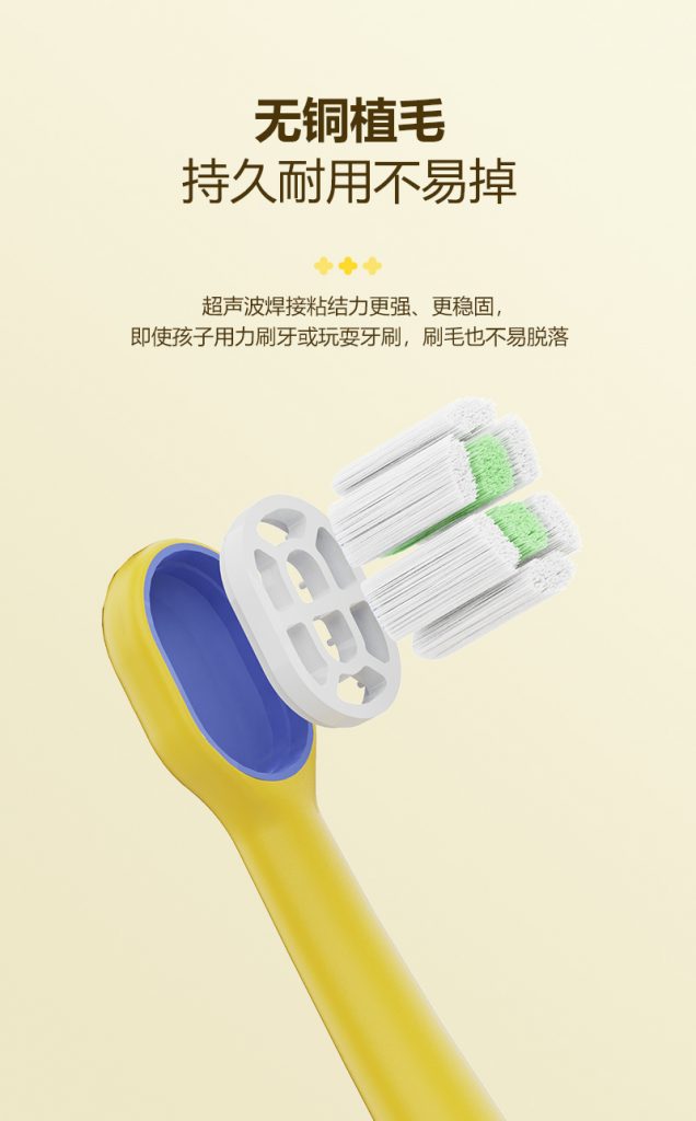 3、耐用植毛:无铜植毛+超声波焊接,粘结牢固,孩子玩耍、用力刷,刷毛不易掉。