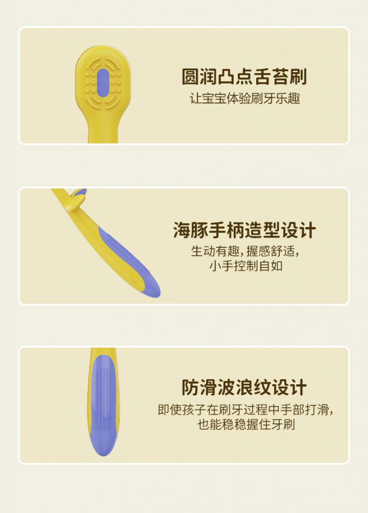 5、细节贴心:可放平设计、凸点舌苔刷、海豚手柄、防滑波纹,兼顾实用与体验。